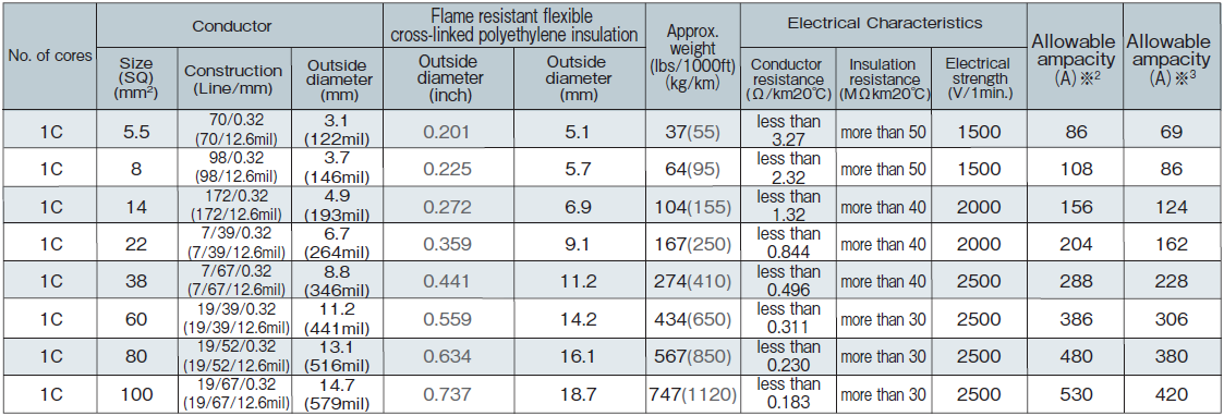 ※² Allowable current for inside equipment use.(Permissible conductor temperature is 125℃.)